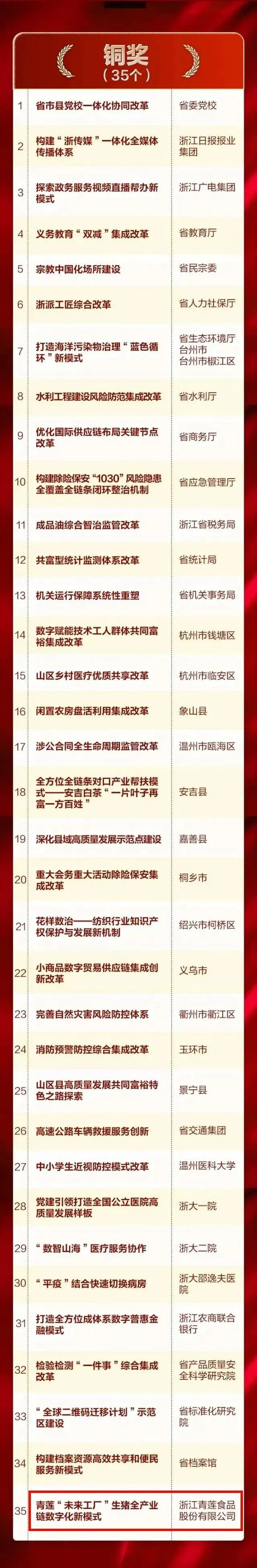 重磅!青蓮食品—膳博士榮獲浙江改革突破獎銅獎! 2023-02-01 09:20:19 浙江青蓮食品股份有限公司 瀏覽次數 1919 近日,浙江省委改革辦公布了2022年度浙江省改革突破獎名單。浙江青蓮食品股份有限公司“數智青蓮”未來工廠榮獲2022年度浙江省改革突破獎銅獎,是銅獎組中唯一的一家民營企業。20多年來,青蓮食品構建起從農場到餐桌的透明全產業鏈,在改革創新中以種業為源頭,建立起未來農場—未來工廠—產業新零售等數字化應用,真正從用戶需求出發為社會提供優質食品!此次獲得浙江改革突破獎銅獎,更是對青蓮食品數字化轉型成果的肯定和勉勵!實現黑豬專家膳博士在安全和美味雙升級上硬核突破!身為黑豬專家,膳博士服務過世博會、世乒賽、國際馬拉松比賽,連續8年為世界互聯網大會供肉,連續14年為中國極地研究中心供肉,成為杭州亞運會官方生鮮肉類產品供應商。以國家級嘉興黑豬和兩頭烏保種場作為種業基礎繁育國家級優質新品種,形成完整的黑豬商品體系為消費者帶來舌尖體驗。近年來,通過智慧養殖為傳統畜牧產業數字化轉型先行探路,以新一代信息技術為手段,重塑生豬全產業鏈生產組織方式和管理服務模式,構建“1+4+N”模型,推動全產業鏈數字化轉型。產業零售端以用戶需求為中心持續推出膳博士黑豬鮮肉鮮制系列產品提升消費體驗,滿足國人對美好生活、品質食品的向往。2022年,青蓮智慧牧場首批入選浙江省“未來農場”,“數智青蓮”未來工廠獲全省數字化改革“最佳應用”和全省數字經濟系統“最佳應用”。在全省數字化改革大會上做匯報演示,列入全省數字經濟系統地方特色應用目錄,受到央視、省級、市縣級等媒體持續關注報道。 上一條“風云浙商”許明曙:人生把一件事做好就很不容易 下一條全國唯一!膳博士·香雪白豬獲2022年度國家新品種認定!
